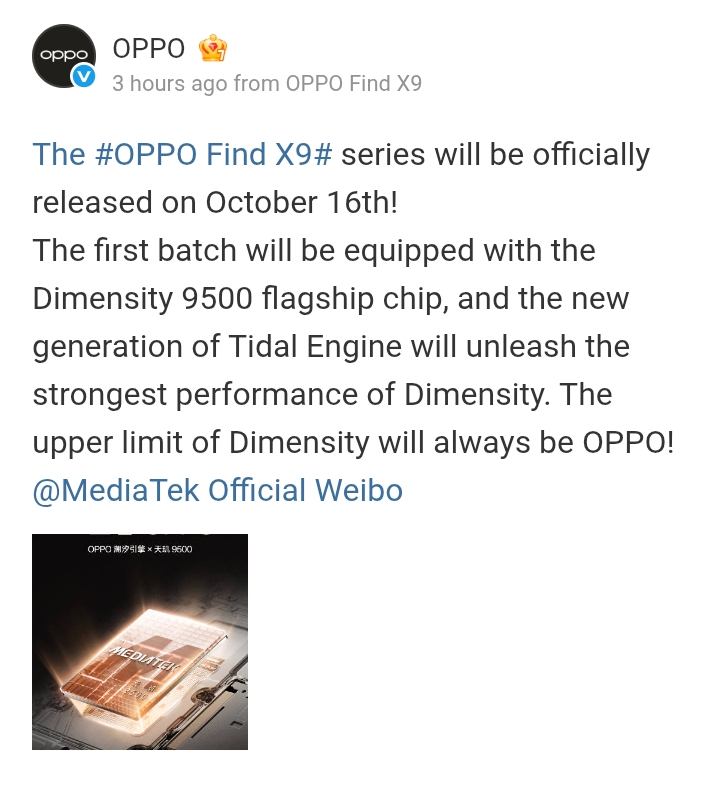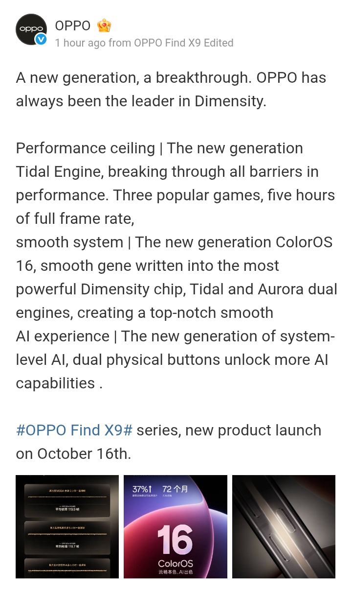 OPPO Find X9 Series Featuring Dimensity 9500 Processor Confirmed to Launch on 16th October 2025 in China; Teased to Feature New Generation Tidal Engine, System Level AI, and ColorOS 16; Rear Camera Module Design Revealed; OPPO Find X9 Pro Official Product Page Now Live; More ColorOS 16 Specs and Features Also Shared