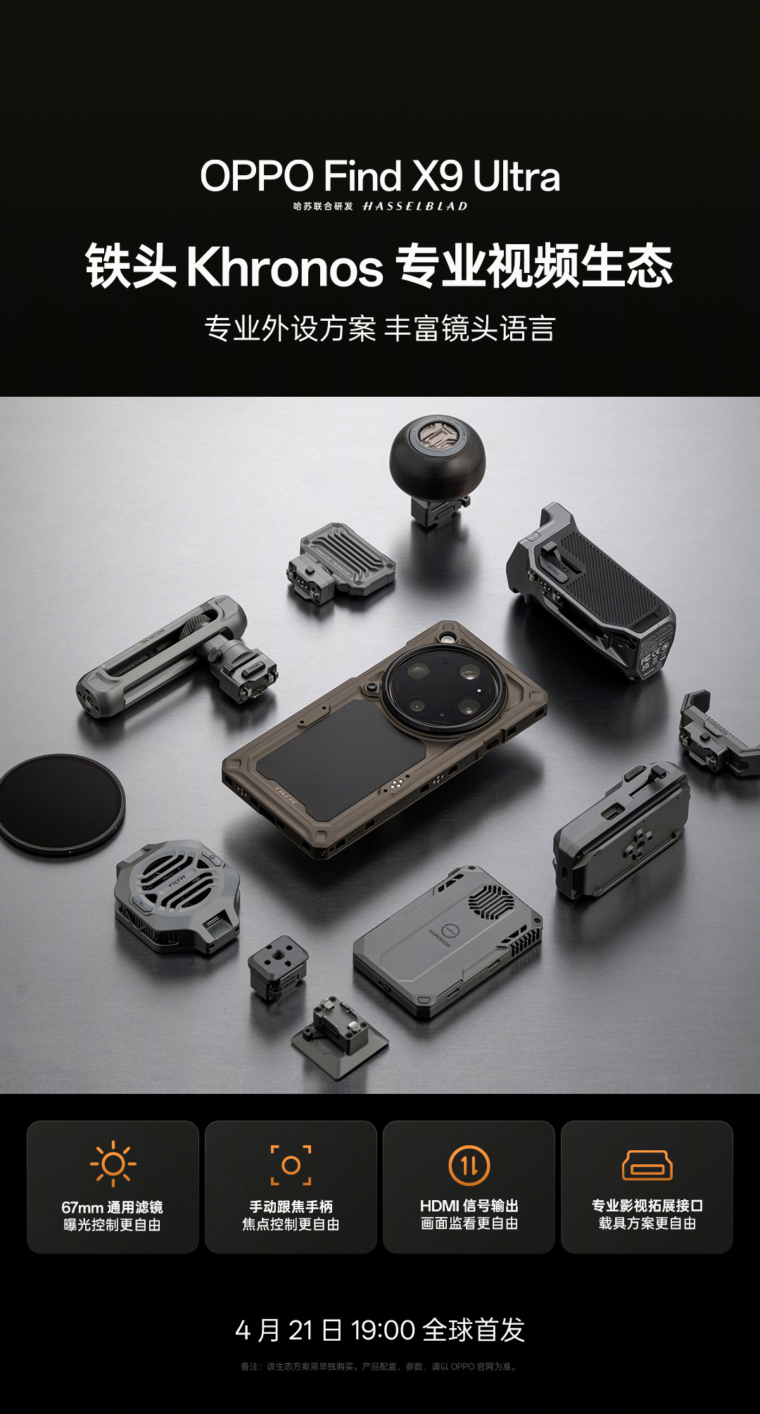 The Khronos Professional Video ecosystem includes a 67mm universal filter (offers greater freedom in exposure control), a manual focus handle (offers greater freedom in focus control), an HDMI signal output (provides greater flexibility in monitoring the screen) and professional film and television expansion interface vehicle solutions (offer greater flexibility).