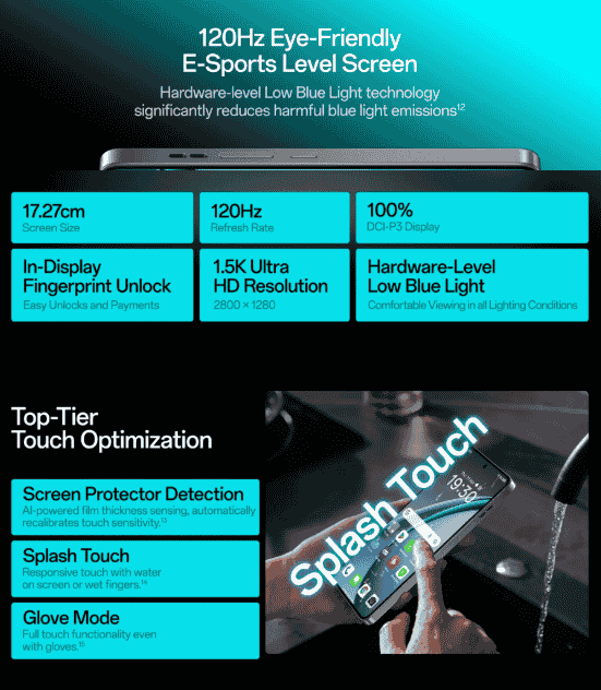 Coming to its display specs, the 120Hz e-sports level flat display has a screen size of 17.27 cm (6.799″), and will offer an eye-friendly user experience thanks to the hardware-level low blue light technology. A 1.5K ultra HD (2800 x 1280 pixels ) resolution, 100% DCI-P3 color gamut, and in-display fingerprint scanner are other key display specs. Speaking more, Screen Protector Detector, Splash Touch, Glove Mode, and flagship-level glass protection are also among its notable specifications.
