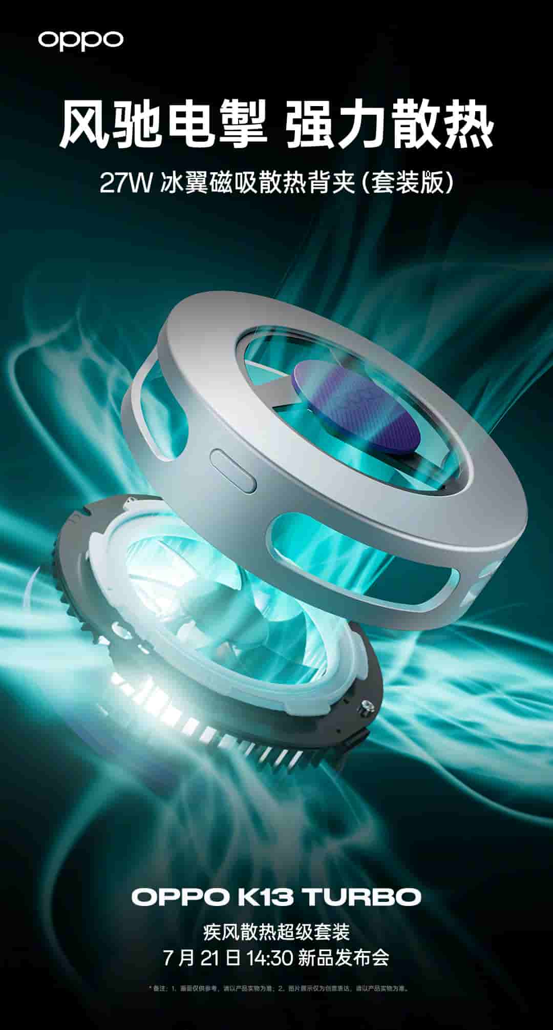 This accessory comes with a new form factor design. It is a liquid cooling + air cooling combo that includes Micro pump circulation, liquid cooling magnetic protection shell and 27W Ice Wing Magnetic Cooling Back Clip (set version). It is said to offer powerful heat dissipation. This accessory will also be launched alongside the Oppo K13 Turbo series.