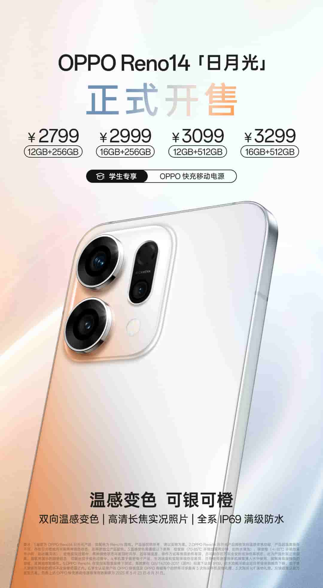 As mentioned, the OPPO Reno 14 ASE color model is now on sale in China, and it can be purchased in four different storage options of 12GB/256GB, 16GB/256GB, 12GB/512GB, and 16GB/512GB at respective price points of CNY 2799, CNY 2999, CNY 3099, and CNY 3299.