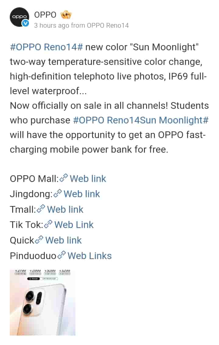 OPPO Reno 14 – New ASE Color Model Now on Sale