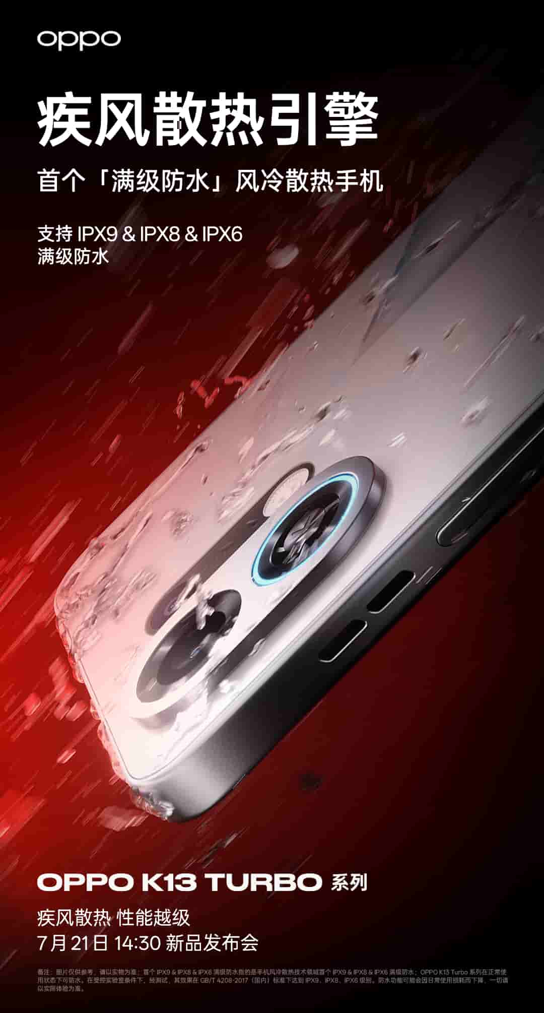 Oppo K13 Turbo Pro is the first fully waterproof air-cooled mobile phone, and it supports IPX9 & IPX8 & IPX6 ratings.