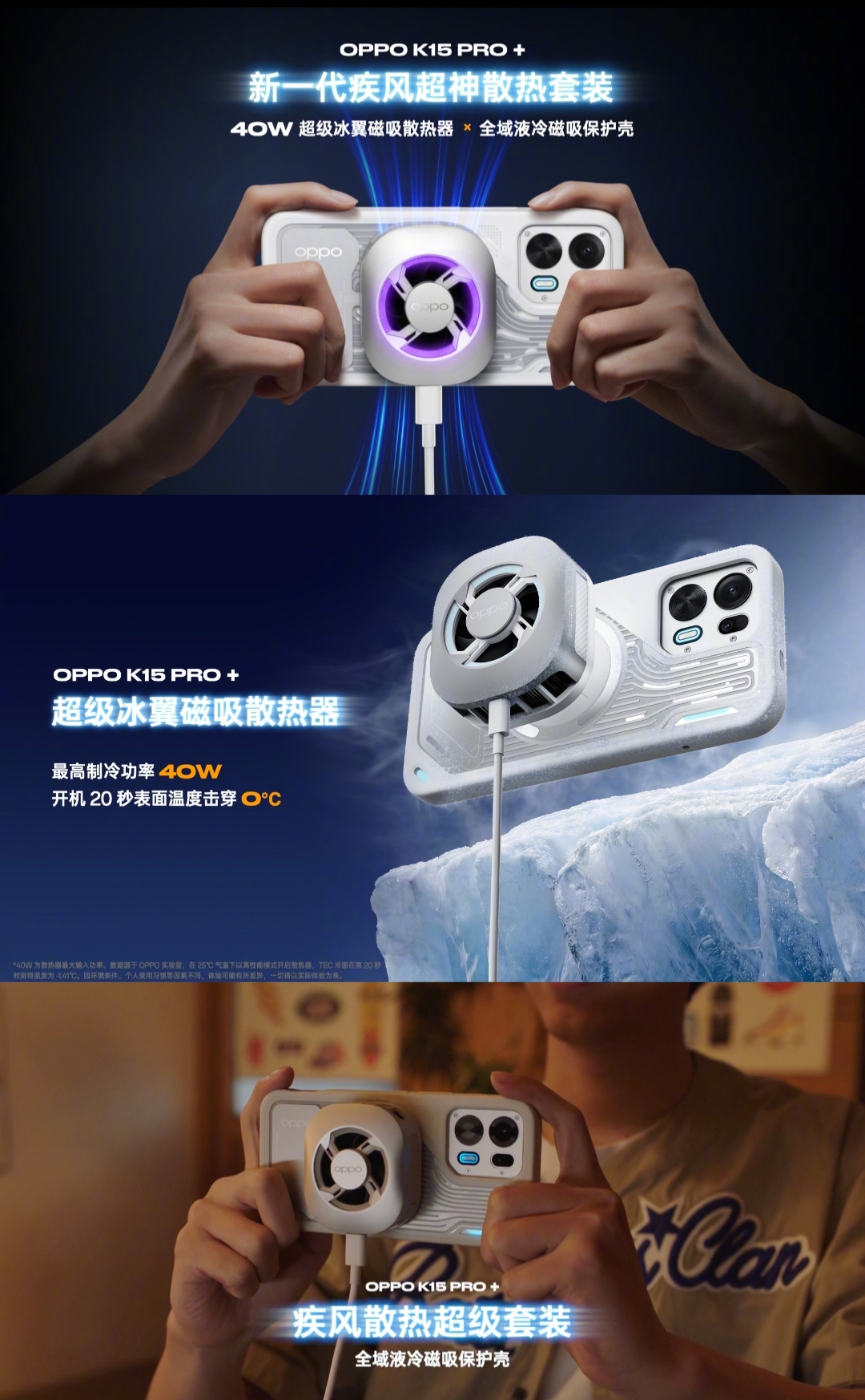The Oppo K15 Pro+ is equipped with a brand-new physical “add-on”- the next-generation Gale Super Cooling Kit. The Ice Wing Magnetic Radiator achieves an unprecedented 40W cooling power for Oppo, easily reducing the surface temperature below 0 degrees Celsius within 20 seconds of power-on.