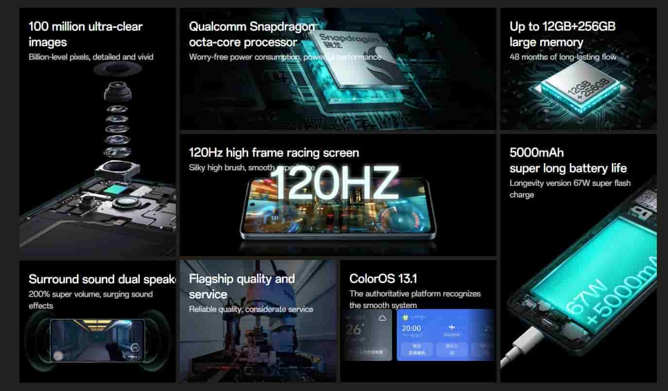 The smartphone sports a 6.7-inch FHD+ LCD display with a 120 Hz refresh rate and 680 nits peak brightness. It is powered by Qualcomm Snapdragon 695 processor which is paired with up to 12GB RAM along with virtual RAM and up to 256 GB internal storage. It runs on ColorOS 13.1 based on Android 13 OS.