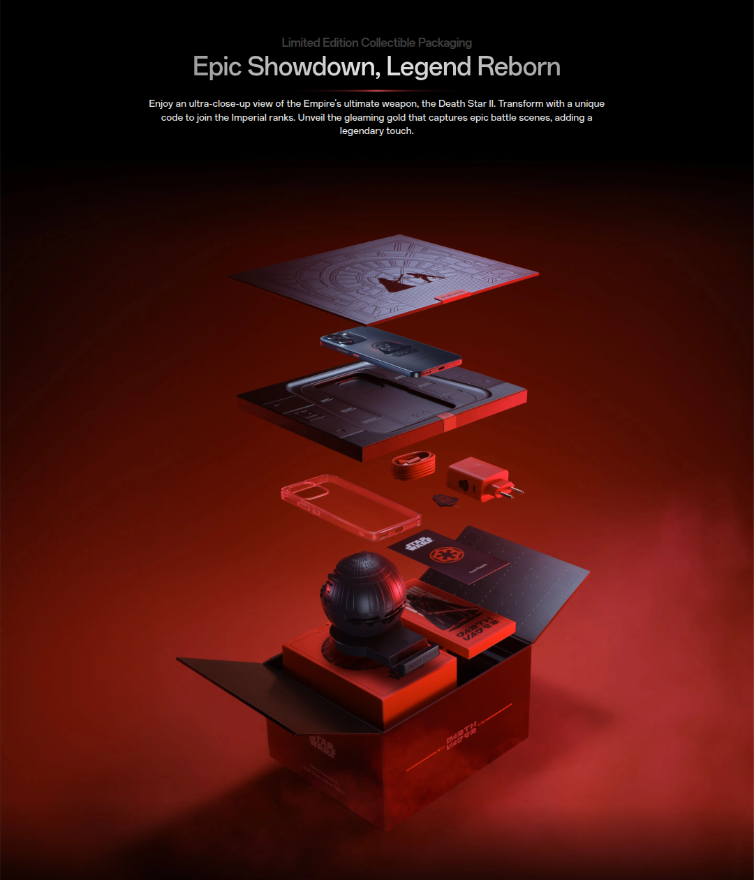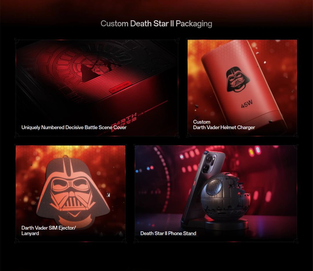 Speaking of the box contents, a Uniquely-Numbered Decisive Battle Scene Cover, Custom Darth Vader Helmet Charger, Darth Vader Sim Ejector/Lanyard, and the Death Star II Phone Stand are offered within the packaging box. The Star Wars wallpaper and animations are also other collaborative design elements.
