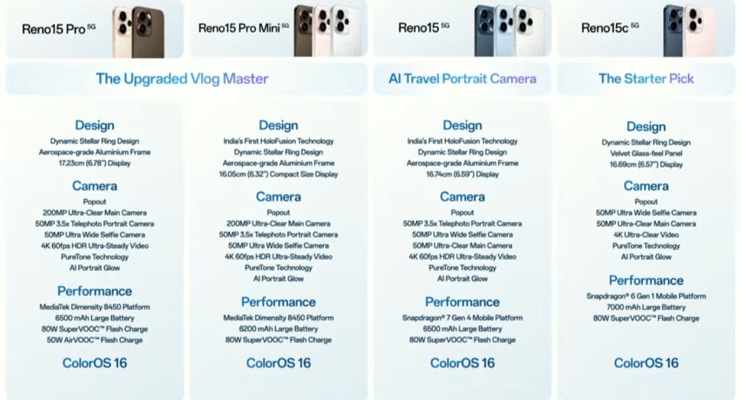 The Oppo Reno 15 5G arrives in Glacier white, Aurora Blue and Twilight Blue colours, the Oppo Reno 15 Pro 5G comes in Sunset Gold and Cocoa Brown colours, the Oppo Reno 15 Pro Mini 5G comes in Glacier white, Crystal Pink and Cocoa Brown colours, and the Oppo Reno 15C 5G comes in Afterglow Pink and Twilight Blue colours.