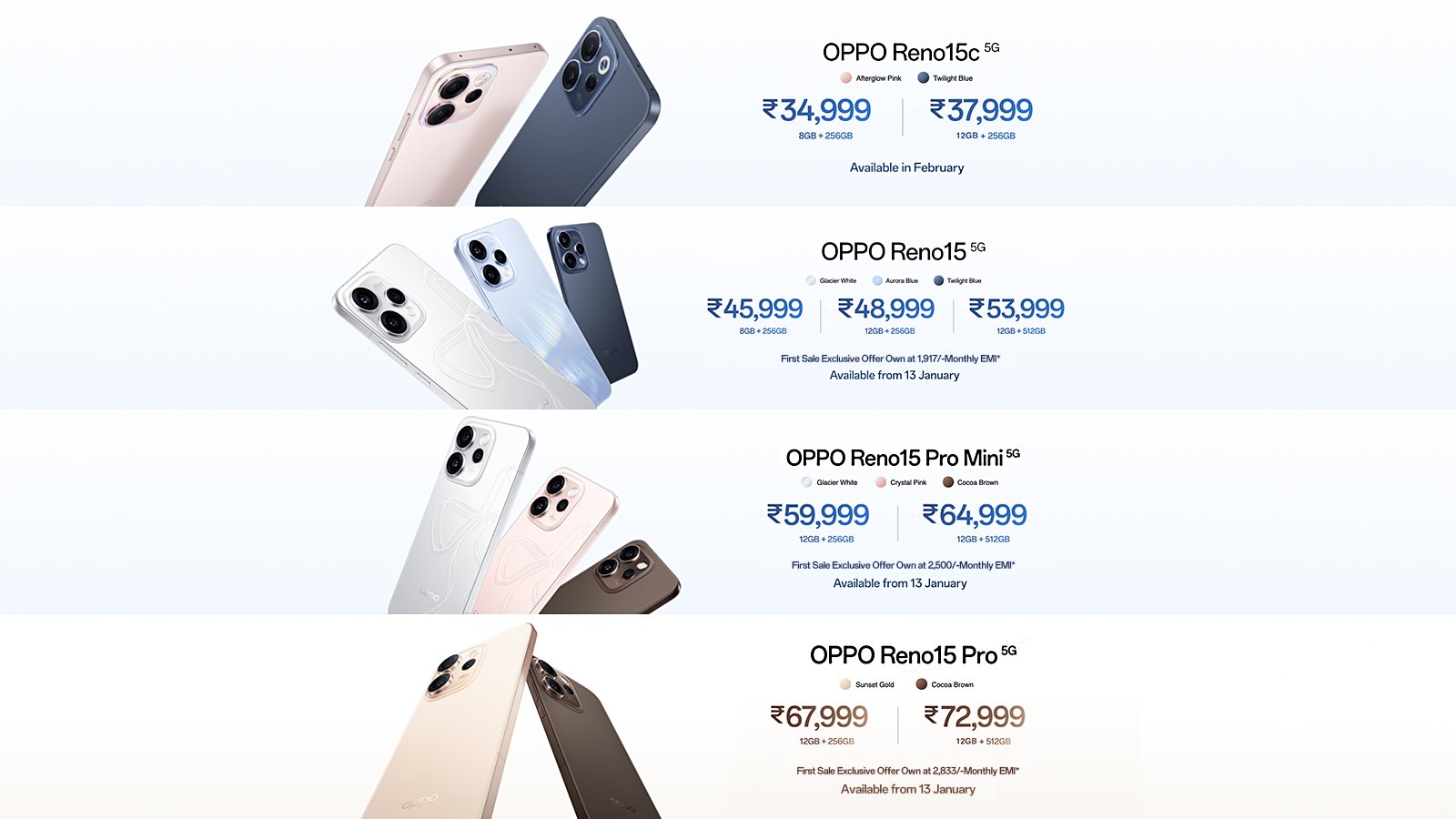 The Oppo Reno 15 5G arrives in Glacier white, Aurora Blue and Twilight Blue colours, the Oppo Reno 15 Pro 5G comes in Sunset Gold and Cocoa Brown colours, the Oppo Reno 15 Pro Mini 5G comes in Glacier white, Crystal Pink and Cocoa Brown colours, and the Oppo Reno 15C 5G comes in Afterglow Pink and Twilight Blue colours.