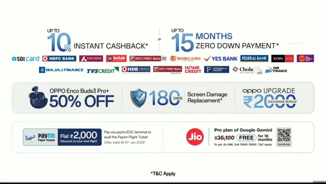 Offers include- up to 10% instant cashback or up to 15 months zero down payment on selected banks, 50% off on Oppo Enco Buds 3 Pro+, 180 days screen damage replacement, Rs 2000 exchange bonus (Oppo upgrade), and Google Pro Plan free for 18 months for Jio users.