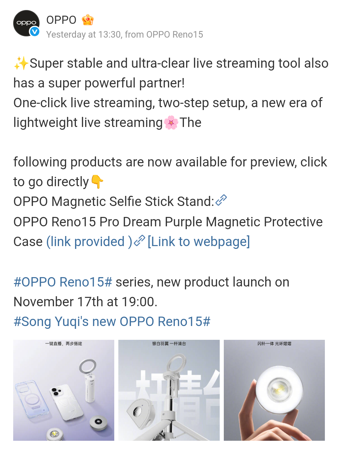 The OPPO Magnetic Selfie Stick Stand and the OPPO Reno 15 Pro Dream Purple Magnetic Protective Case are now made available for preview. Along with the mentioned streaming tools, an OPPO Magnetic Small Halo Flash Light will also be offered to Chinese consumers.