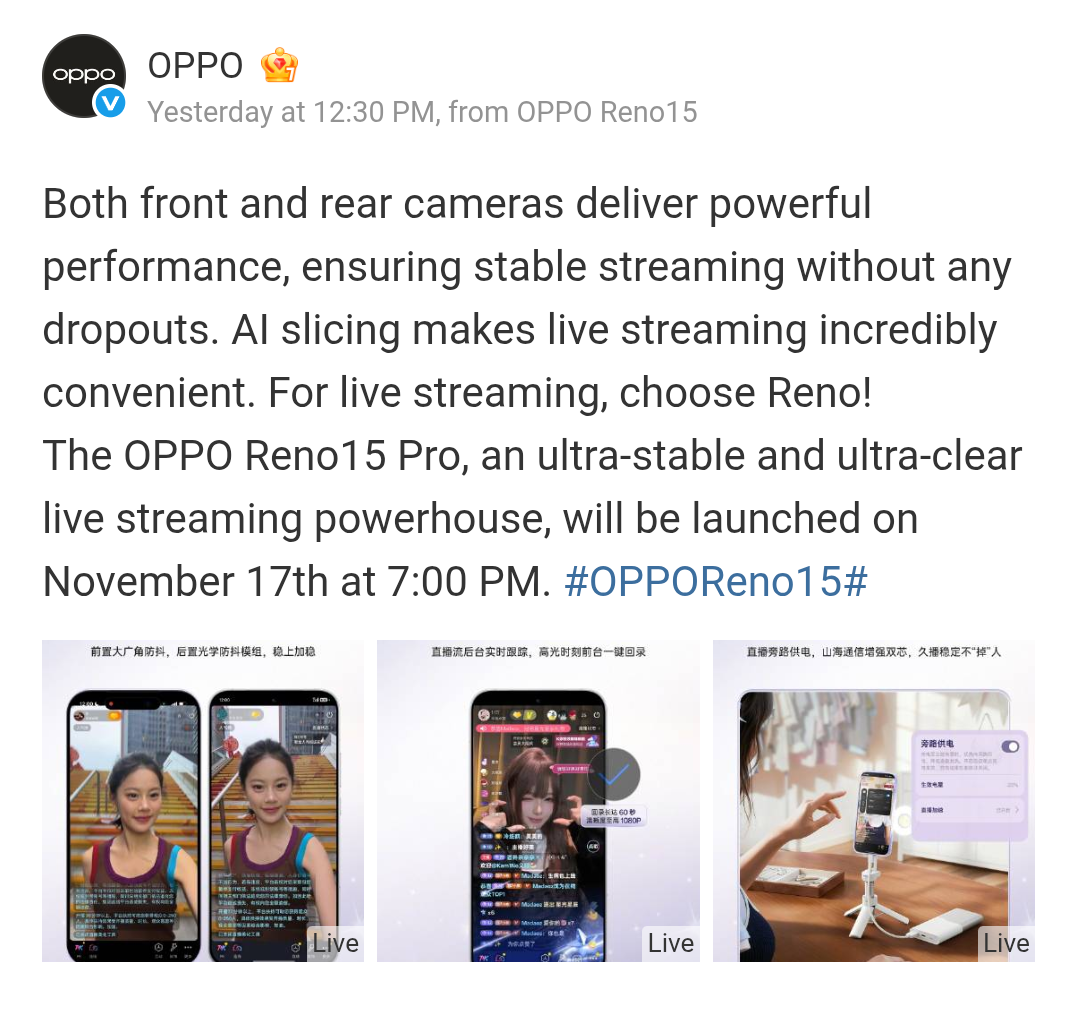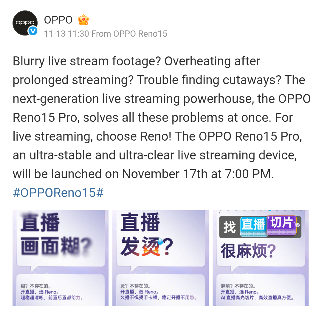 As per the newly-shared teasers, the Reno 15 Pro smartphone is pointed out to offer improved live streaming experience by addressing the issues regarding blurry live stream footage, overheating during prolonged streaming, and cutaway troubles. The upcoming device is teased as the next-generation live-streaming powerhouse that offers super-stable super-clear front and rear cameras, AI-powered highlight slicing capability, and more.