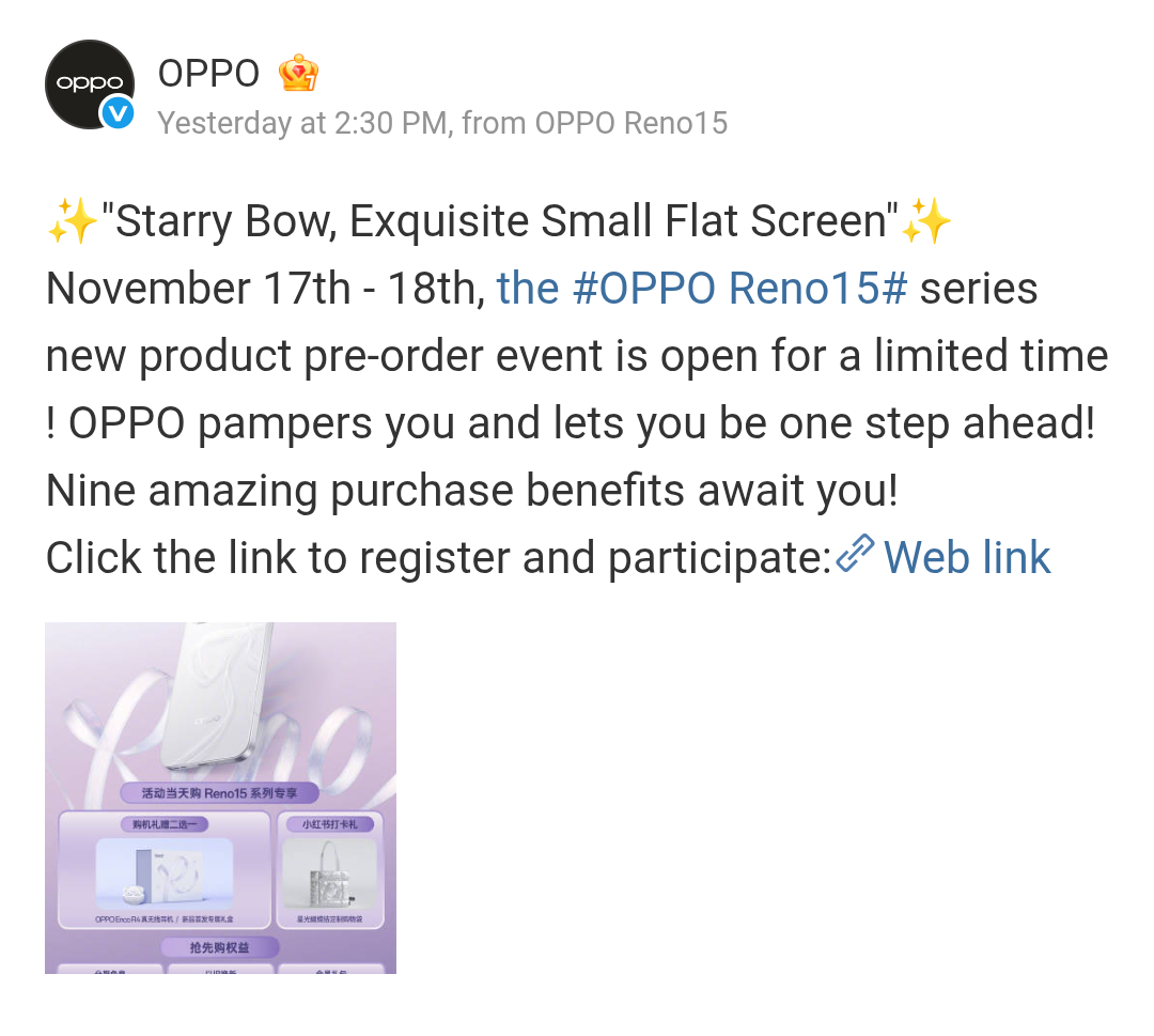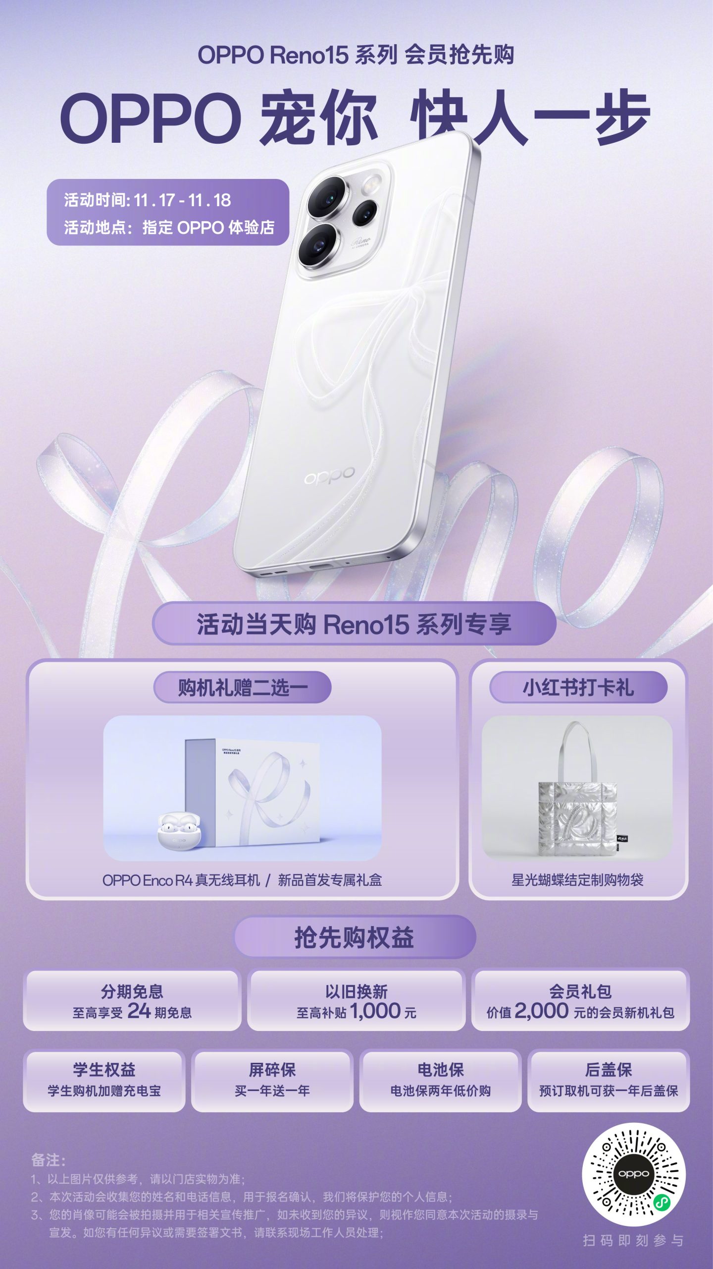 From the 17th to the 18th of November 2025, the OPPO Reno 15 series new product pre-order event will be conducted for a short period of time. Nine purchase benefits have also been made ready for interested consumers, and they can register now to participate in it. The purchase benefits include free goodies like the OPPO Enco R4 True Wireless Earbuds/New Product Launch Exclusive Gift Box (one of them) and Starlight Bow Custom Shopping Bag, as well as early bird purchase rights like up to 24 months interest-free installments, up to CNY 1000 trade-in subsidy, phone gift package worth CNY 2000, free power bank, 1-year screen protection purchase for added 1-year free screen protection, two-year battery warranty, and one-year back-cover warranty.