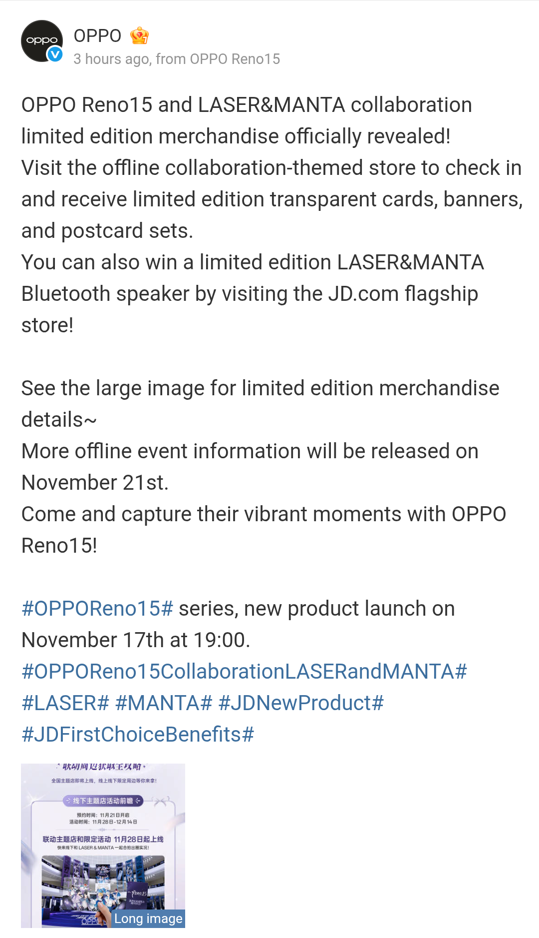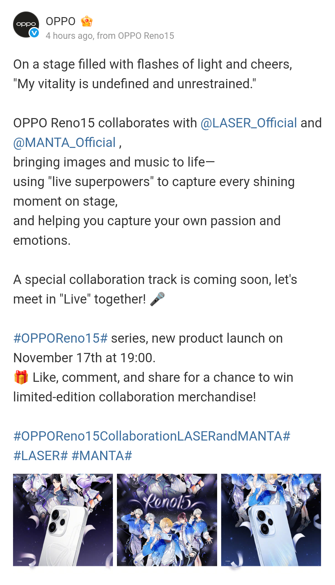 OPPO Reno 15 Pro Live Streaming Specs Teased; OPPO Reno 15 Laser & Manta Collaboration Announced; Reno 15 Series Pre-Order Benefits Shared