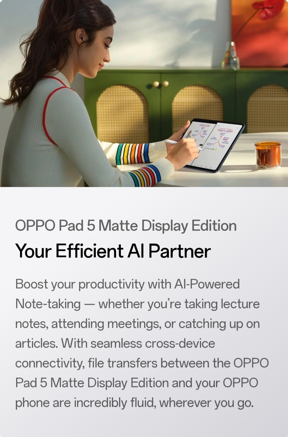 Oppo Pad 5 Matte Display edition is teased to arrive with features like AI Notes and seamless cross-device connectivity. The tablet looks like the upcoming Oppo Pad Air 5 rather than the Oppo Pad 5 that was launched in China, which is actually a rebranded OnePlus Pad Go 2. The Oppo Watch S is teased to arrive with an 8.9mm ultra-slim body and support seamless phone connectivity.