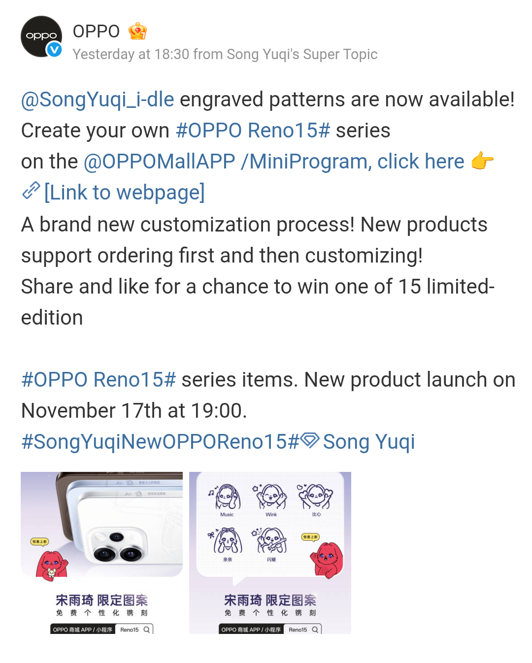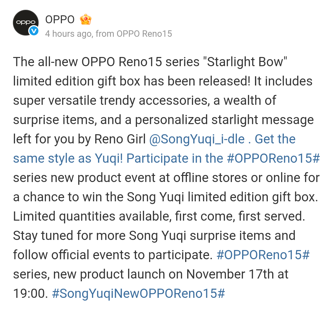 On the OPPO Mall app and Mini Program, customers are now being offered the Song Yuki engraved patterns and they can create their own designs. Also, the contents that will be offered within the OPPO Reno 15 Series Starlight Bow Limited Edition Gift Box have also been revealed, and it includes many trendy accessories, surprise items, and a personalized message by Song Yuqi herself (~ custom mobile phone case, custom phone case charms, custom magnetic airbag support, Sony Yuqi customized photo card, Song Yuqi custom acrylic refrigerator magnets, custom CCD camera, and Song Yuqi stickers). Only a limited quantity will be available, and it will be offered at a first come, first serve basis.