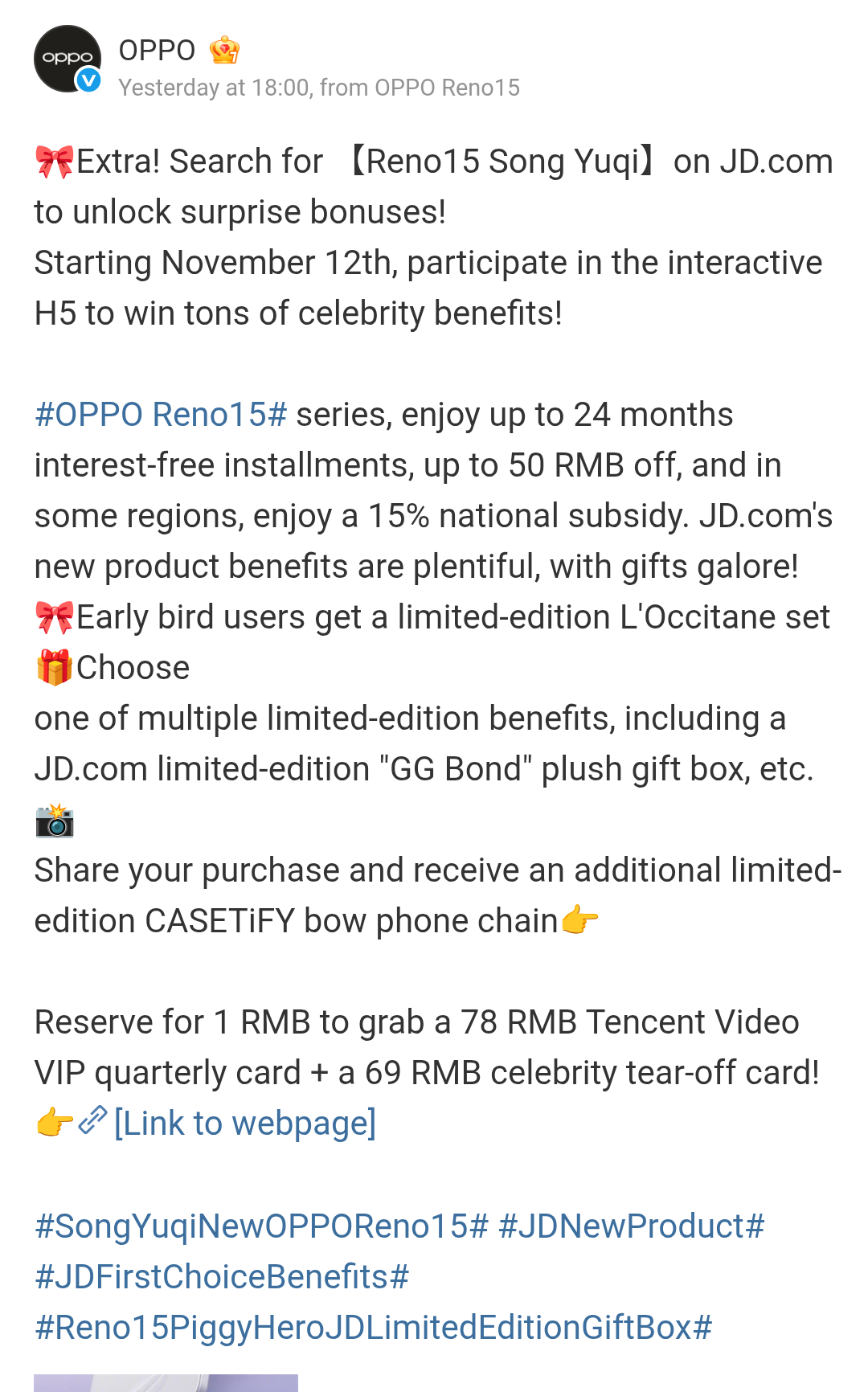 From the 12th of November 2025, tomorrow, Chinese customers can search for Reno 15 Song Yuqi on the JD.com, and by participating on the interactive H5, they will be able to win tons of celebrity benefits. As per the details shared, these will include up to 24 months interest-free installments, up to CNY 50 off, 15% national subsidy, and many more. Early bird customers are also revealed to get a limited edition L’Occitane set. The JD.com ‘GG Bond’ plush gift box is also part of the benefits. Also, by sharing the purchase, customers will also be able to receive an added limited edition CASETiFY bow phone chain. On reserving the series for CNY 1, CNY 78-worth Tencent Video VIP quarterly card and CNY 69-worth celebrity tear-off card can both be availed by Chinese customers too.