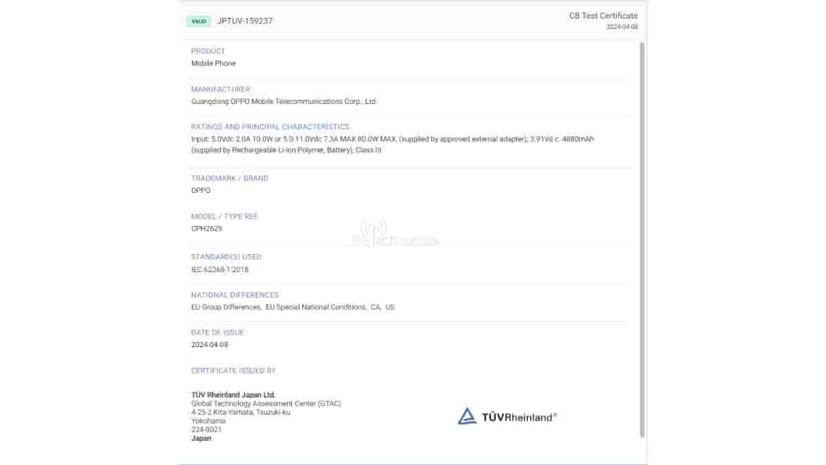 The Tech Outlook has spotted an Oppo smartphone with model number CPH2629 on TUV Rheinland database and also on Import Export Website.