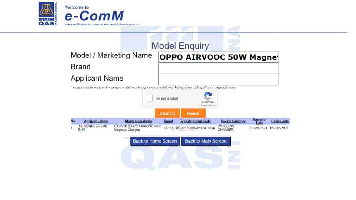Coming to the AIRVOOC 50W magnetic charger, it bears the model number – ‘OAWV08’ and has received SIRIM certification with type approval code – ‘RGIH/57C/0924/S(24-3964)’. The certification validity will be till the 5th of September 2027.