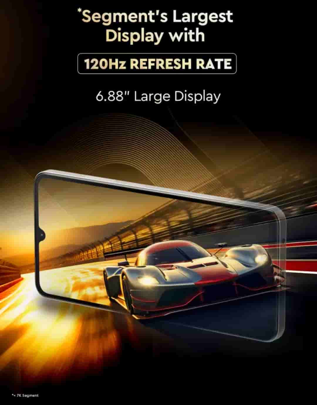 The device is revealed to launch in the less than Rs 7K segment. It is revealed to feature a 6.88-inch eye-friendly display that offers a 120Hz refresh rate. The smartphone is TUV Rheinland triple certified- TUV Low Blue Light, TUV Flicker-free, and TUV Circadian. It supports wet hand touch. It comes with a Split grid design with flashy camera deco and arrives in three color options- Power black, Cool blue, and Desert Gold.