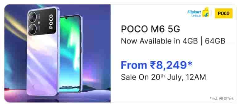 As per the above image, POCO M6 5G 4GB/64GB will be available at Rs.8,249 including all the offers. This new variant will be going on sale on 20th July from 12AM onwards via Flipkart. Other than the storage configuration, the device is expected to boast the same specs as that of previous variants.