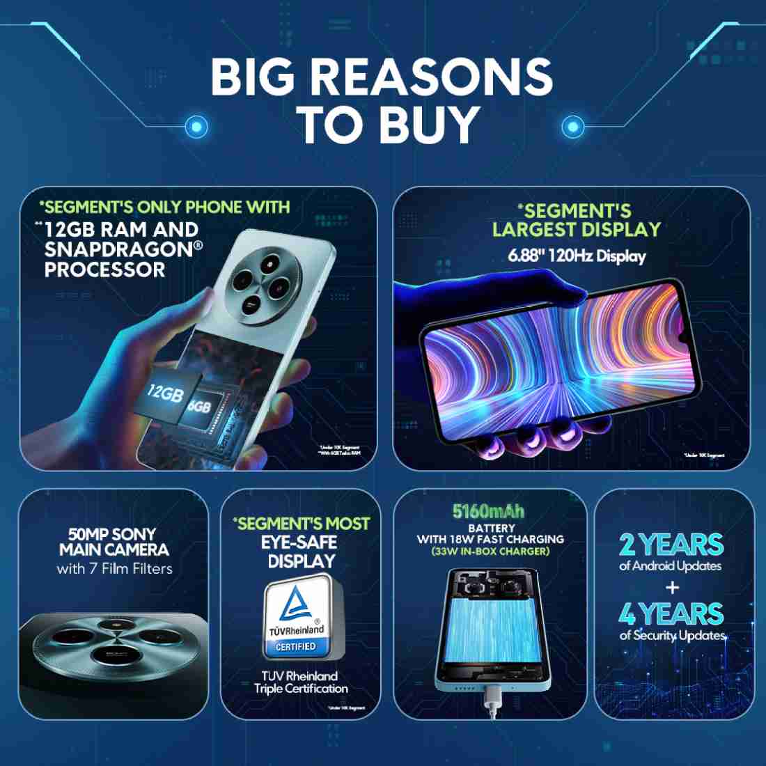 It packs up a 50MP Sony IMX852 main camera on the rear side and an 8MP front camera. The smartphone is backed by a 5160 mAh battery that supports 18W charging while the device is accompanied by a 33W charger. Other features include- TUV Rheinland Low Blue Light and Flicker-free certifications, and additional RAM expansion up to 12GB. side-mounted fingerprint sensor, Bluetooth 5.0, 3.5 mm audio jack, WiFi 802.11 a/b/g/n/ac, nano SIM, IP52 rating, and speaker with 150% super volume.