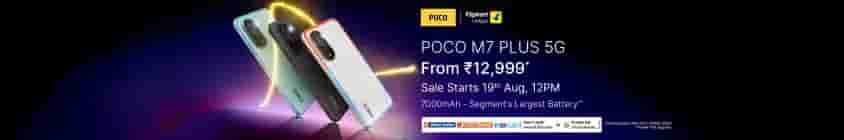 The Poco M7 Plus 5G is priced in India at ₹13,999 for the 6GB + 128GB variant, while the 8GB + 256GB model is available for ₹14,999. Sales will begin on August 19 via Flipkart, with colour options including Aqua Blue, Carbon Black, and Chrome Silver.
