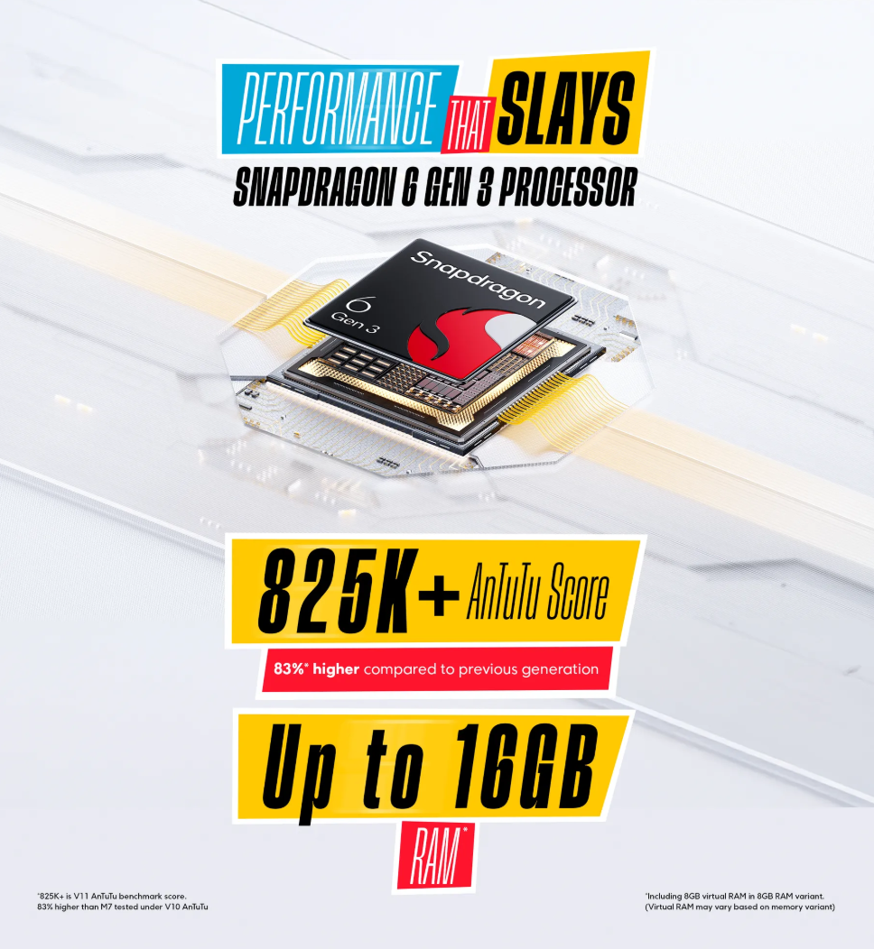 As per the new details that have been shared, the POCO M8 5G smartphone will be breaking its cover with Qualcomm’s Snapdragon 6 Gen 3 processor onboard, and it will be coupled with up to 16GB of RAM (8GB inbuilt + 8GB virtual). The device is also pointed out to have achieved 825K+ points overall performance score on the AnTuTu database, and this is claimed to be 83% higher when compared to its predecessor.