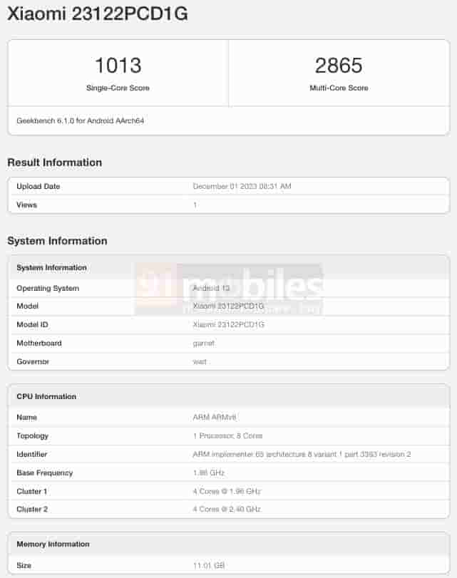 The smartphone received a single-core score of 1013 points and a multi-core score of 2865 points. The database reveals that the device will be powered by an octa-core processor with a maximum CPU clock speed of 2.40GHz which is likely the Snapdragon 7s Gen 2 chipset. It is also revealed that the smartphone will run on Android 13 OS and will arrive with 12GB RAM.
