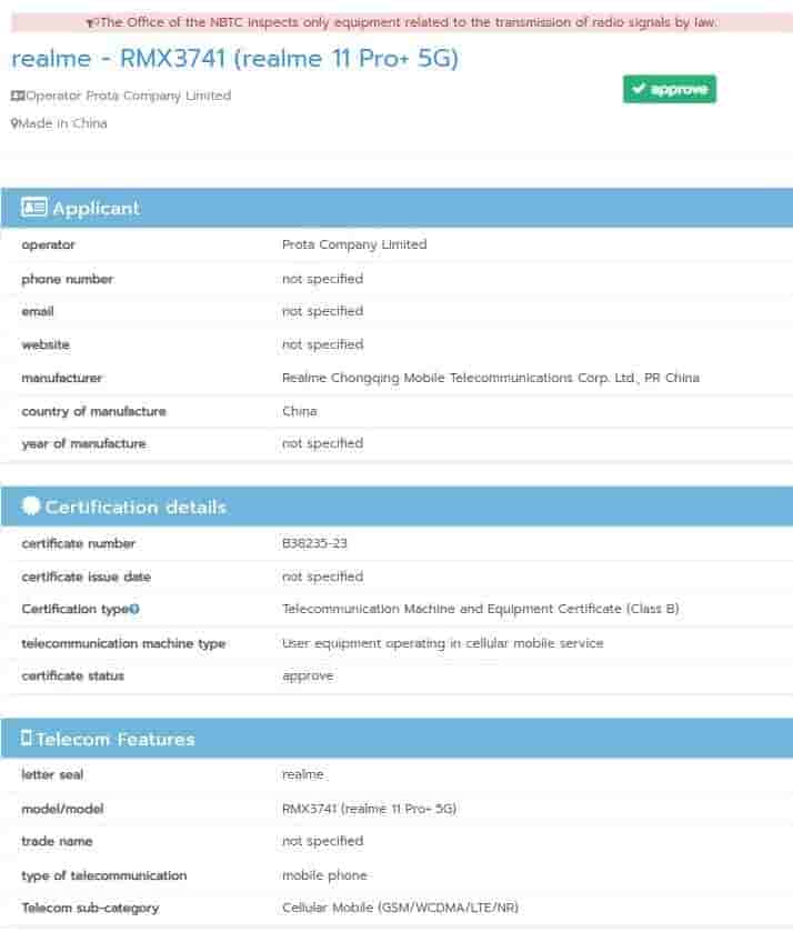The smartphone has been spotted on the NBTC website with model number RMX3741. This website only revealed the moniker name of the smartphone-Realme 11 Pro+5G.