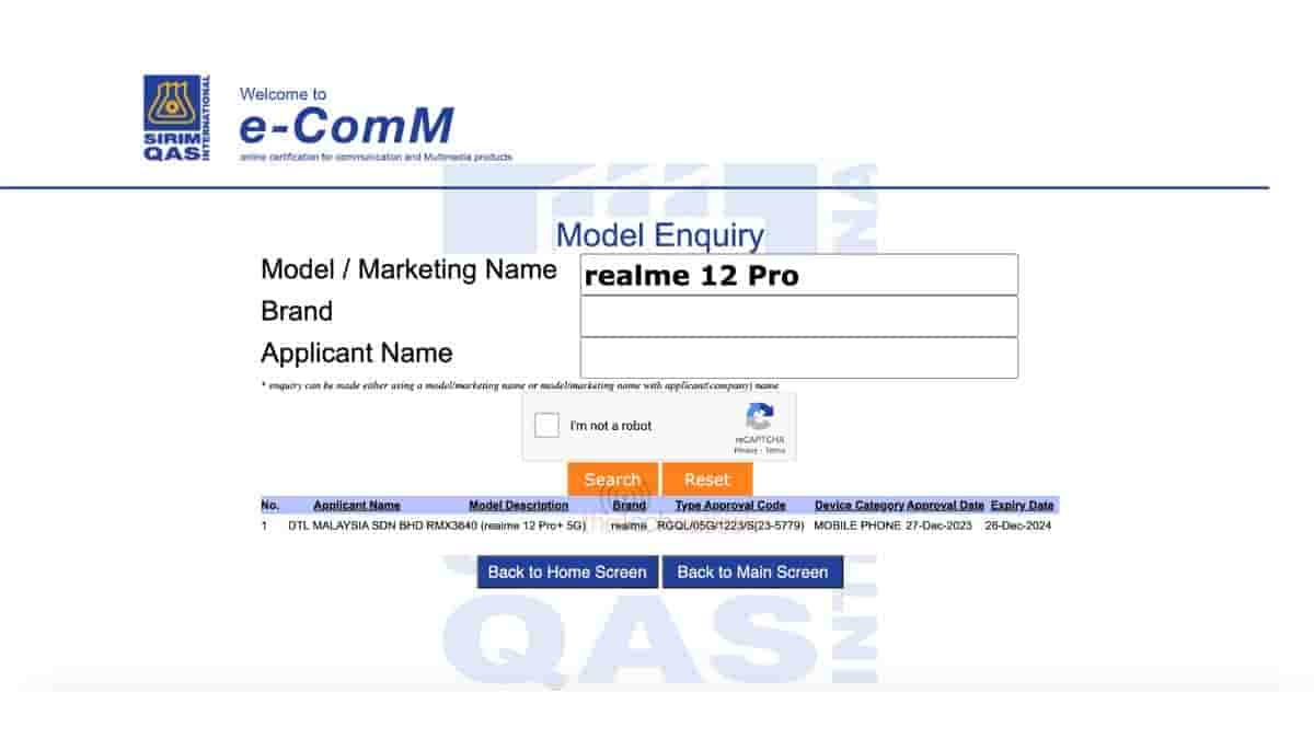 Today our team at The Tech Outlook spotted Realme 12 Pro+ 5G on Malaysia’s SIRIM certification website with model number RMX3840 and type approval code RGQL/05G/1223/S (23-5779).
