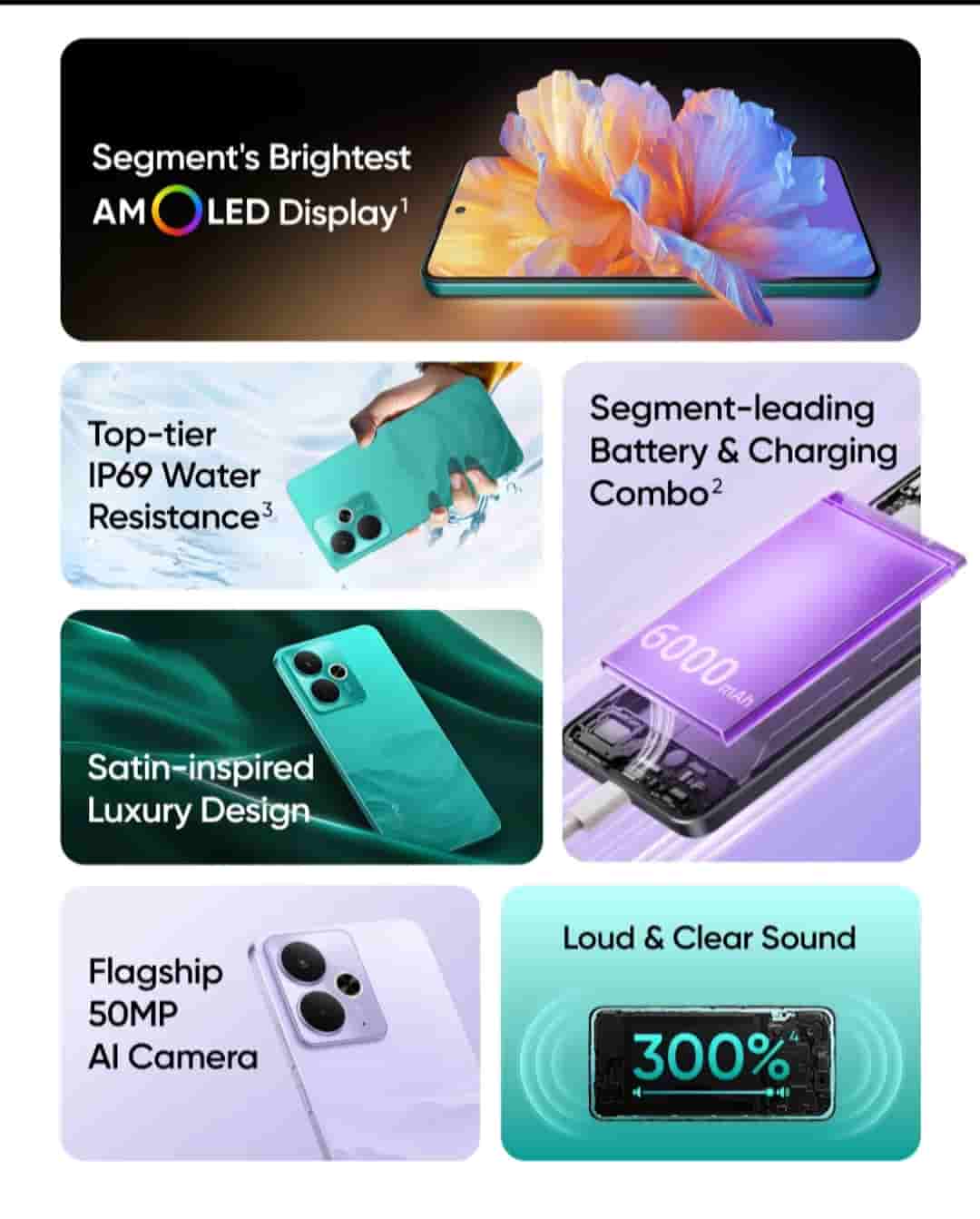The device is backed by a 6000 mAh battery and supports 45W fast charging. Other features include- IP66/IP68/IP69 rating, satin inspired design, 10GB virtual RAM, dual SIM, two rear LED lights, USB Type-C port, Bluetooth 5.3, WiFi 5, under screen optical fingerprint sensor, TUV Low Blue Light certification, dual stereo speaker, Antenna Array Matrix 2.0, Bionic VC cooling system, AI Eraser, AI Clear face, AI Motion Deblur and AI HyperRAW Algorithm.