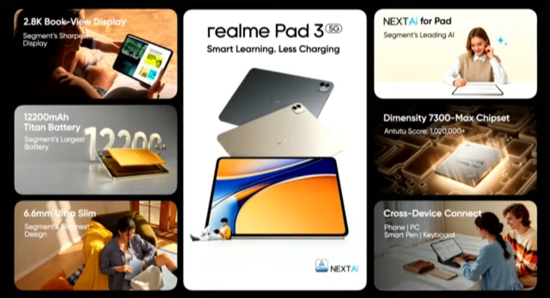 It is powered by MediaTek Dimensity 7300 Max SoC and runs on Realme UI 7.0. The tablet is equipped with quad speakers, a side-mounted fingerprint sensor, and 8MP front and rear camera sensors. It boasts features like AI Recording summary, Circle to search, and Google Gemini. AI Documents, Air Gestures, PC connect, and cross-device connect. Its accessories include the Realme Smart Pen and Realme Pad 3 keyboard.