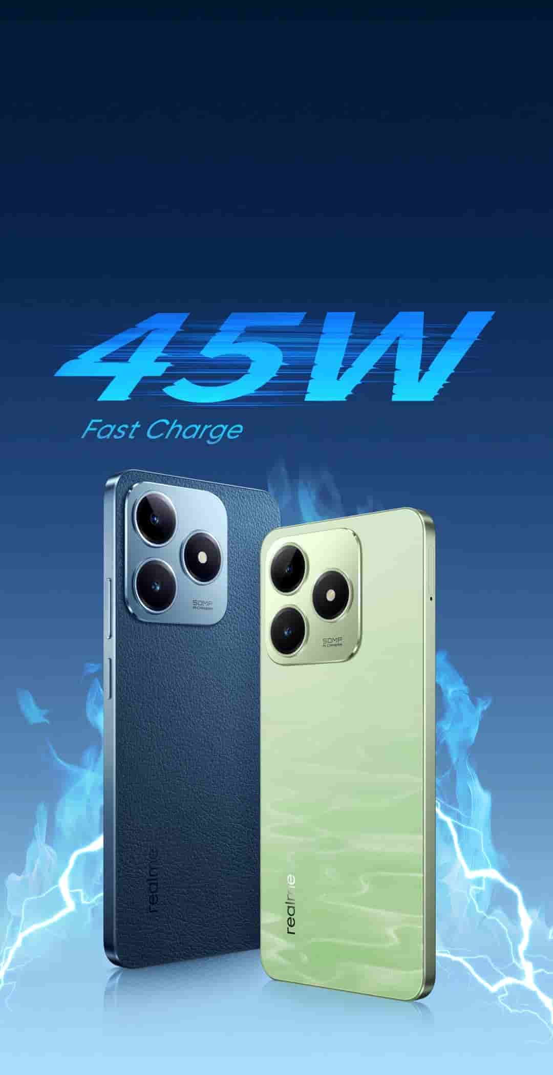 The Realme C63 smartphone features a 6.7-inch wide 90Hz display with up to 450nits of peak brightness, touch sampling rate up to 180Hz, and 1600*720 pixels resolution. It is powered by a UNISOC T612 Octa-Core 12nm processor paired with the Mali-G57 GPU. The smartphone packs up to 8GB LPDDR4X RAM with 128GB storage that is expandable up to 2TB through an external SD card. In the camera department, it has got a 50MP AI Camera on the rear and an 8MP Selfie Camera on the front. It is backed by a 5000mAh battery that supports 45W SuperVOOC fast charging. Additionally, it also comes with a 3.5mm audio jack, a side-mounted fingerprint sensor, a USB Type-C port for charging, NFC support, and Air Gesture Control. Its blue color variant comes with a vegan leather back and green with a glass back.