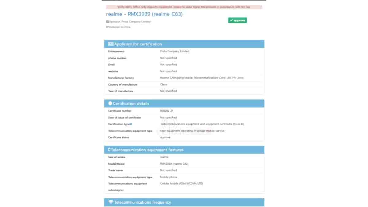 We have earlier spotted the Realme C63 device on TUV Rheinland, SDPPI, and Camera FV5 database while the device also bagged India’s BIS certification confirming its India launch. Today this device has been spotted on Thailand’s NBTC certification website too with model number RMX3939.