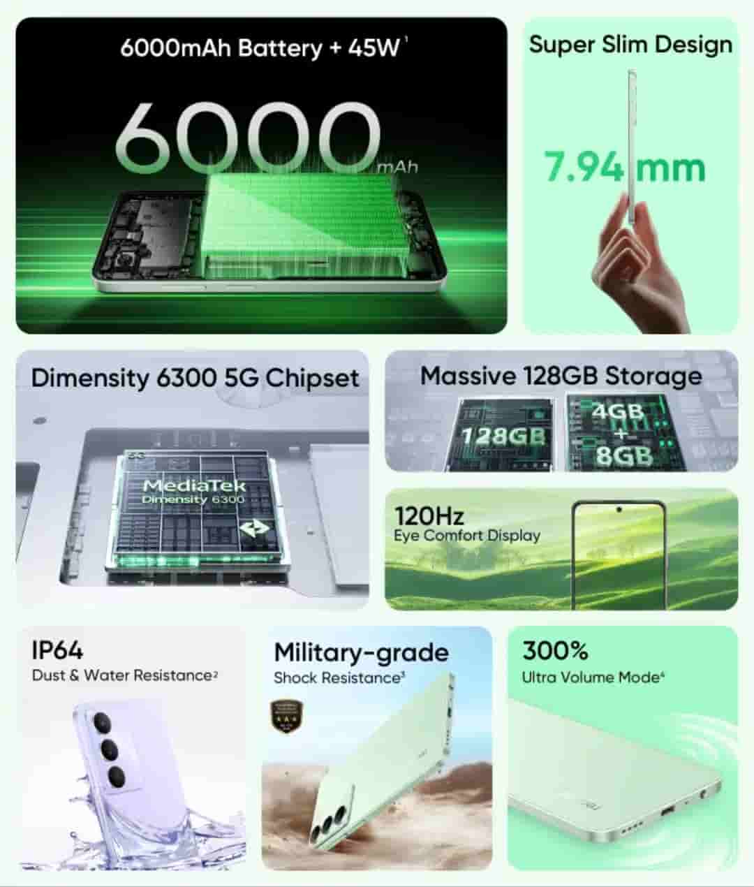 The device features a 120Hz Eye Comfort display. It is powered by MediaTek Dimensity 6300 SoC paired with 4GB+8GB RAM and 128GB internal storage. The smartphone is backed by a 6000 mAh battery and supports 45W fast charging and 5W reverse charging. Users can enjoy 46.4 hours of phone calls, 17.9 hours of Instagram, 15.7 hours of YouTube streaming, and 13.3 hours of gaming. It comes with a 7.94mm thin body.