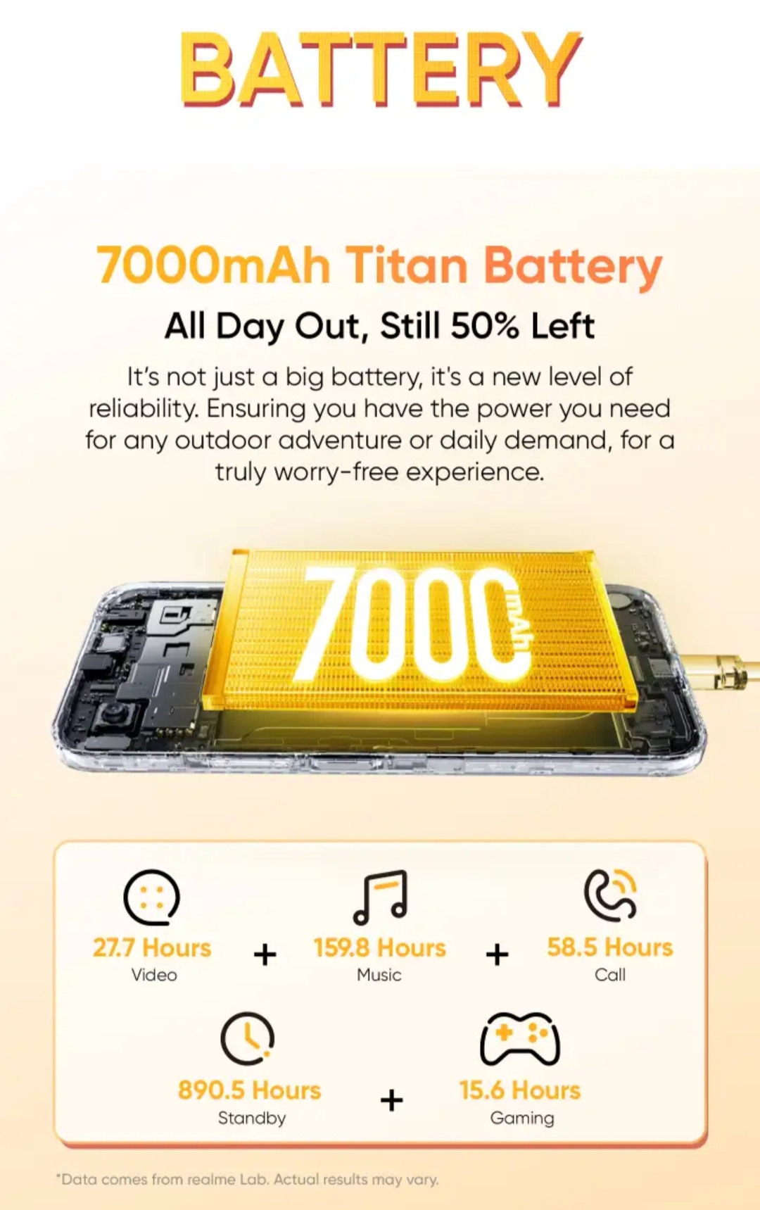 The smartphone is backed by a 7000 mAh Titan battery that maintains consistent power across a wide temperature range, from -20 degrees Celsius to 53 degrees Celsius. It comes with 6-year battery health. The device offers 27.7 hours of video streaming, 159.8 hours of music playback, 58.5 hours of calling, 890.5 hours of standby and 15.6 hours of gaming.