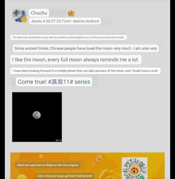 For Realme China Marketing Director Jessie its a dream come true moment when he took a clear image of the Moon. He posted an image of the Moon on Weibo captured by the Realme 11 Pro+ smartphone and wrote in Chinese “I have been looking forward to a mobile phone that can take pictures of the moon and I have a wish come true”. Jessie has not shared any detail about the camera used to capture the image but we expect it to be a dedicated telephoto module.