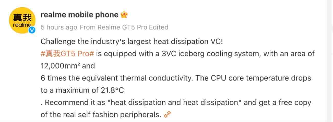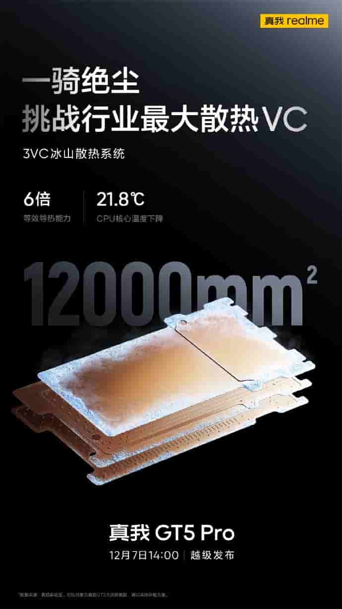 Realme has today officially revealed that Realme GT 5 Pro will be equipped with the industry’s largest heat dissipation VC- 3VC iceberg cooling system with an area of 12000mm2 and 6 times the equivalent thermal conductivity. With the help of this cooling system the CPU core temperature drops to a maximum of 21.8- degree Celsius.