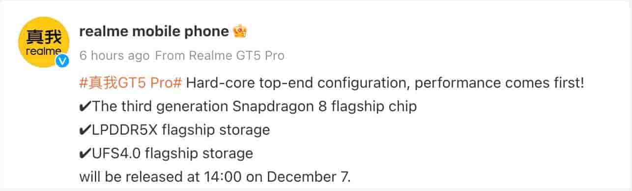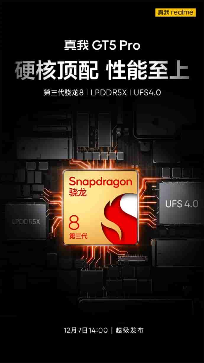Realme GT 5 Pro will be arriving with a Snapdragon 8 Gen 3 SoC that will be paired with LPDDR5X RAM and UFS 4.0 internal storage.