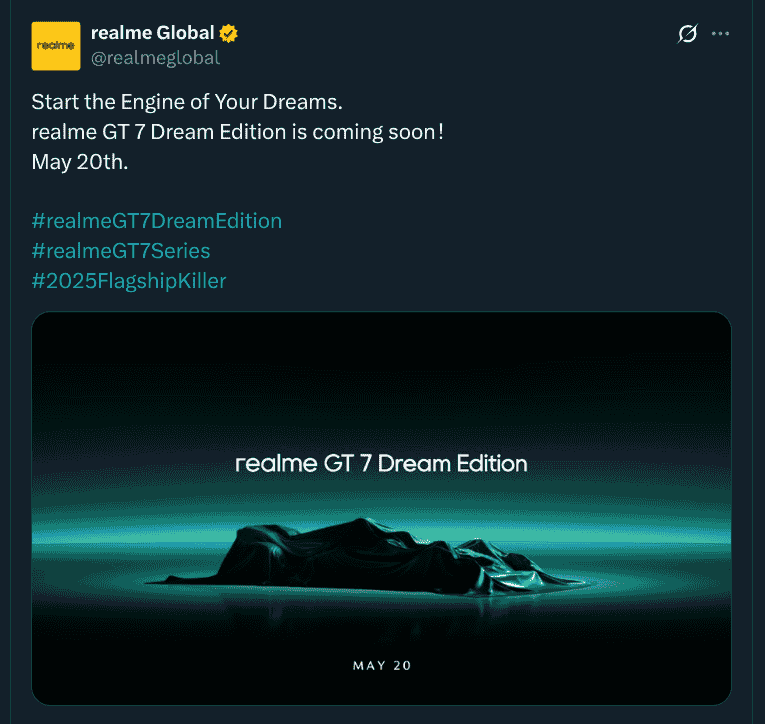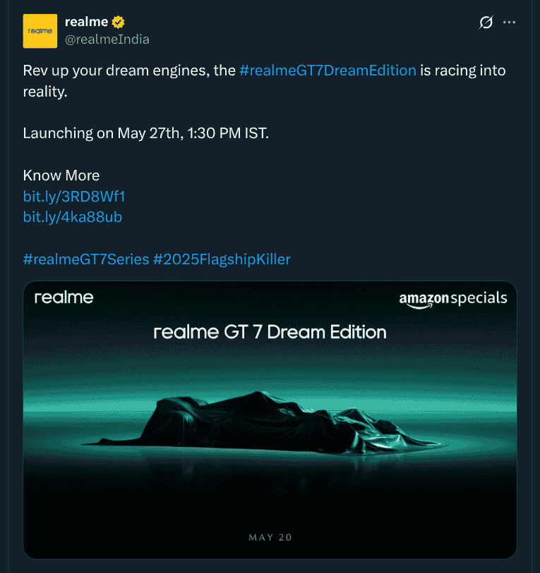 Realme India via its official X handle has teased the GT 7 Dream Edition, confirming that it will be launching on the 27th of May 2025 at 01:30 PM IST. It will also be an Amazon Specials product in the country, meaning Amazon will be the official online shopping partner for the Realme GT 7 Dream Edition model too in the Indian market, just like for the GT 7 and GT 7T models.