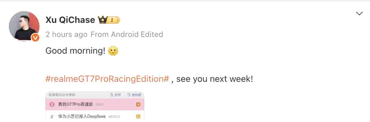 The smartphone brand Realme yesterday teased that Realme GT 7 Pro Racing Edition will be launching this month in the Chinese market but the launch date was still not revealed by the company. Well, Realme Vice President and China President, Chase Xu has now revealed that this upcoming smartphone will be launching next week in the Chinese market.