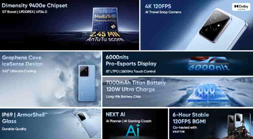 The smartphone features a 6.78-inch Pro-Esports display that offers 6000 nit peak brightness, 2160Hz PWM Dimming, 2600Hz instantaneous touch response, 360Hz touch sampling rate, 120Hz refresh rate, and 1.5K resolution. It is powered by MediaTek Dimensity 9400e SoC paired with LPDDR5X RAM and UFS 4.0 storage. It runs on Realme UI 6.0 based on Android 15 OS. It is backed by a 7000 mAh battery and supports 120W ultra charging.