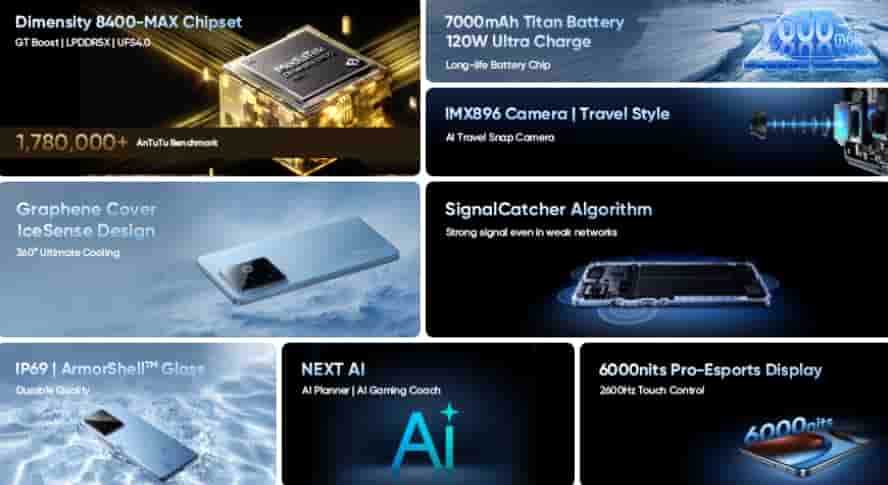 The device packs up a 50MP Sony IMX906 main camera, a 50MP Samsung S5KJN5 sensor, and an 8MP wide-angle camera on the rear side, while on the front it features a 32MP Sony IMX615 selfie camera. Other features include- 360-degree Ultimate Cooling, SignalCatcher chip, dual-band WiFi, Bluetooth 5.4, NFC, OReality audio, dual-mic noise cancellation, dual Nano SIM, Hi-Res audio, ArmorShell glass, IP69 rating, Next AI, GT Boost, IceSense design, 12GB Dynamic RAM, Rain Water Smart Touch, AI Travel snap camera, and 7700mm2 vapor chamber.