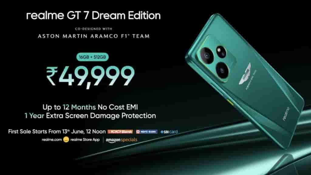 This model retains the same specs as the Realme GT 7 model, but there is only a single storage option- 16/512GB. This handset is co-designed with the Aston Martin Aramco F1 team. It boasts Aston Martin’s green color and has a silver wing logo at the back with the Formula One Team printed. It comes inside a special box that includes an F1 racecar SIM ejector pin and a silver wing phone case. The device features custom wallpapers, icons, and themes. This model is priced at Rs 49,999.