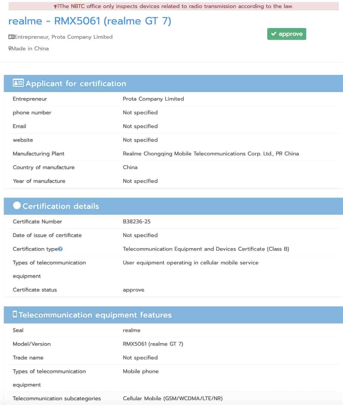 Realme GT 7 (RMX5061) spotted on NBTC certification website; Global launch seems imminent
