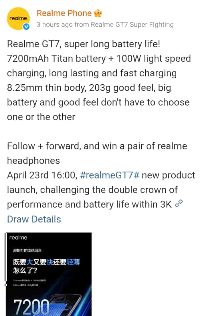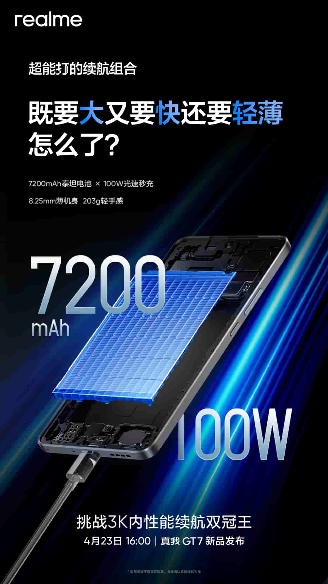 The Realme GT 7 smartphone as per the new teaser updates will be featuring an 8.25 mm thin body and will be packing a large 7200 mAh titan battery backup. The tagline – ‘Super long battery life, super thin body’ has also been used to tease the device.