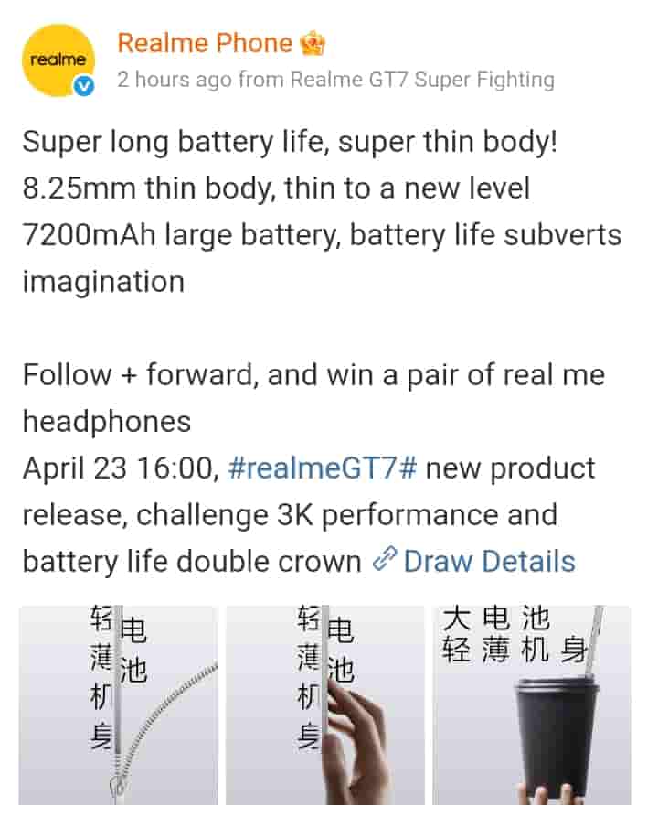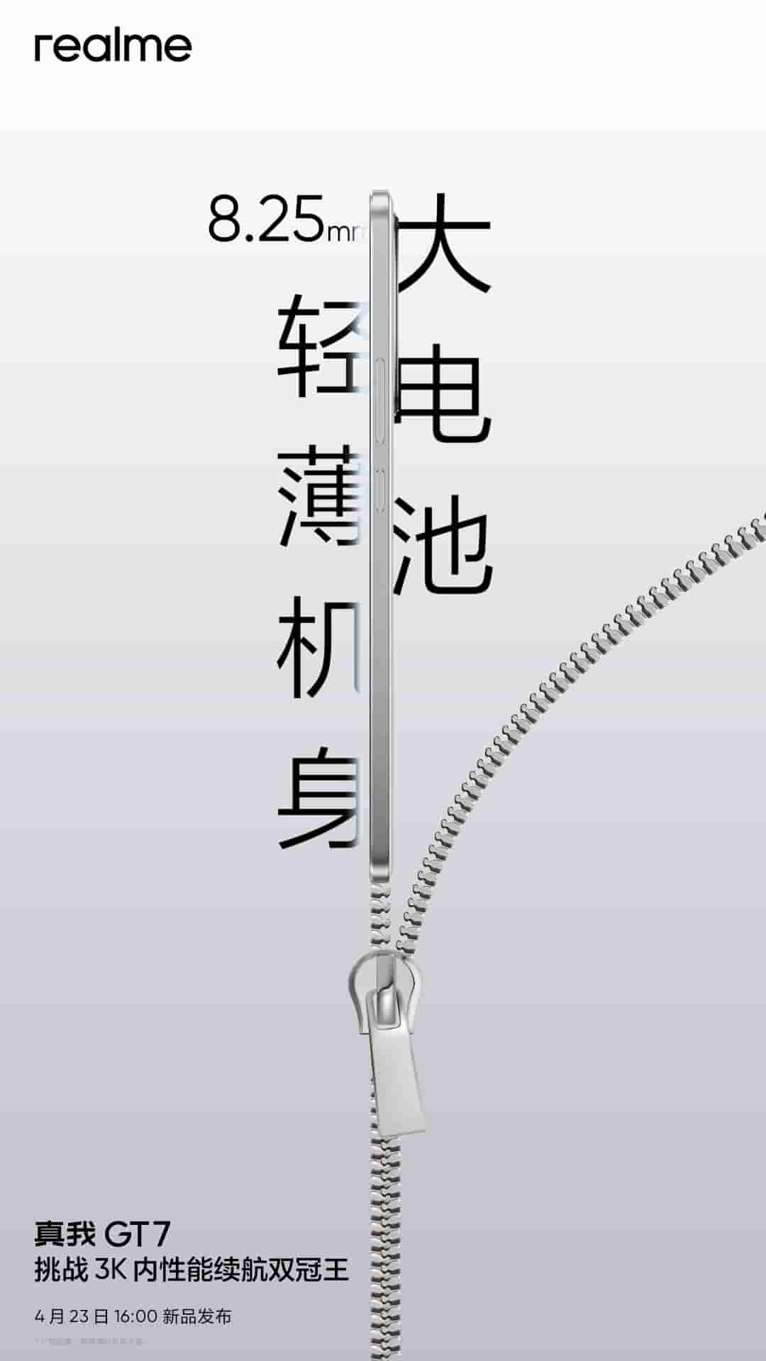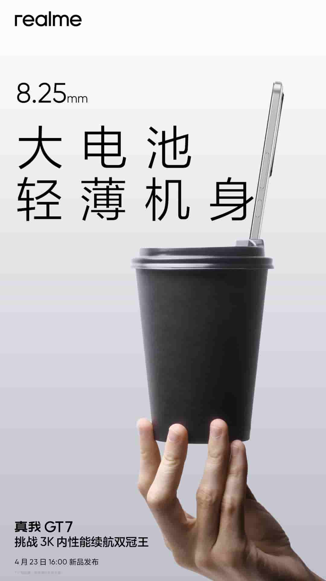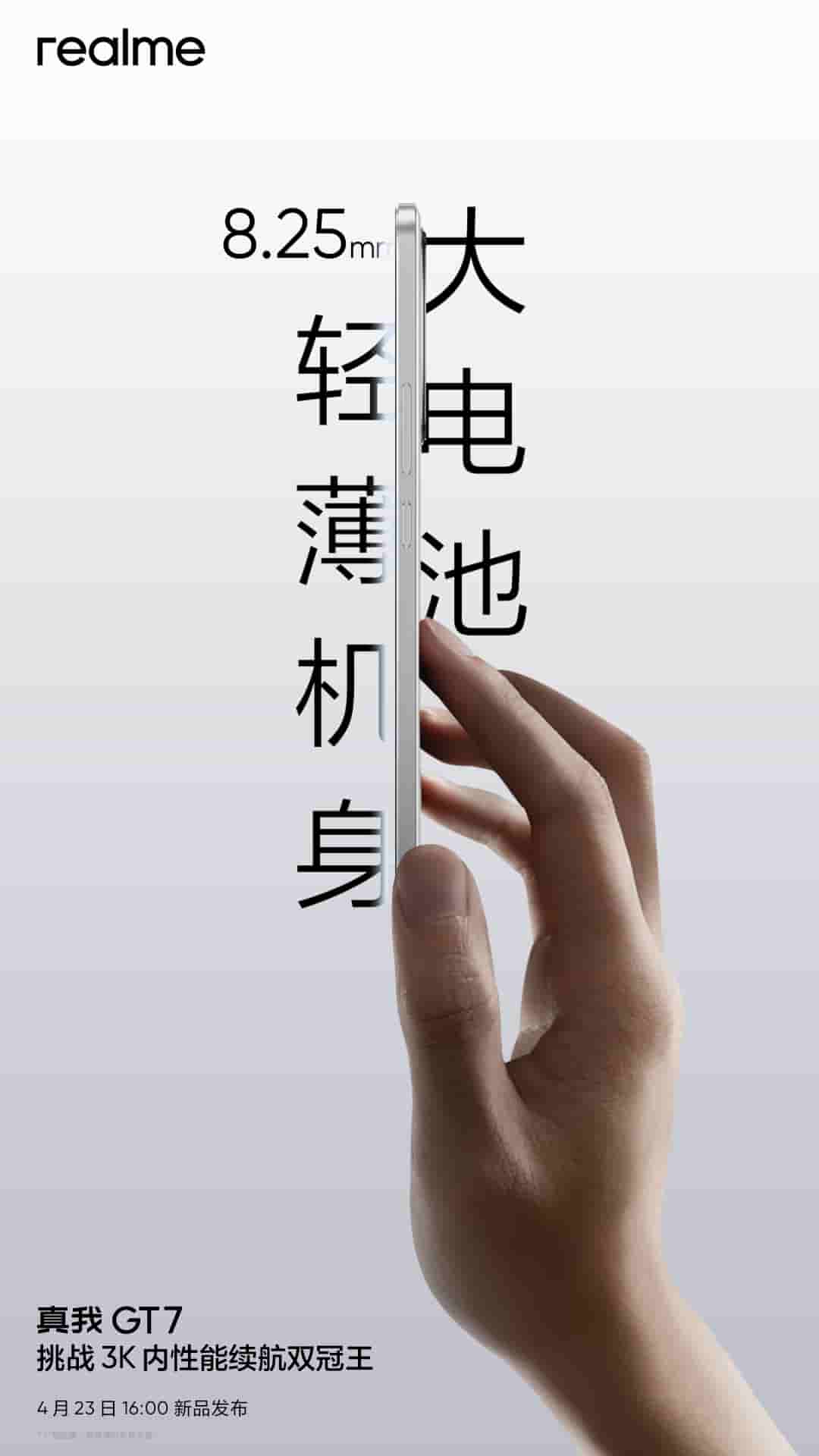The Chinese smartphone maker – Realme quite recently confirmed the launch of its next GT 7 smartphone in its home market and following the performance and gaming related specs, Realme has now officially teased the thickness and battery specs of the upcoming device.