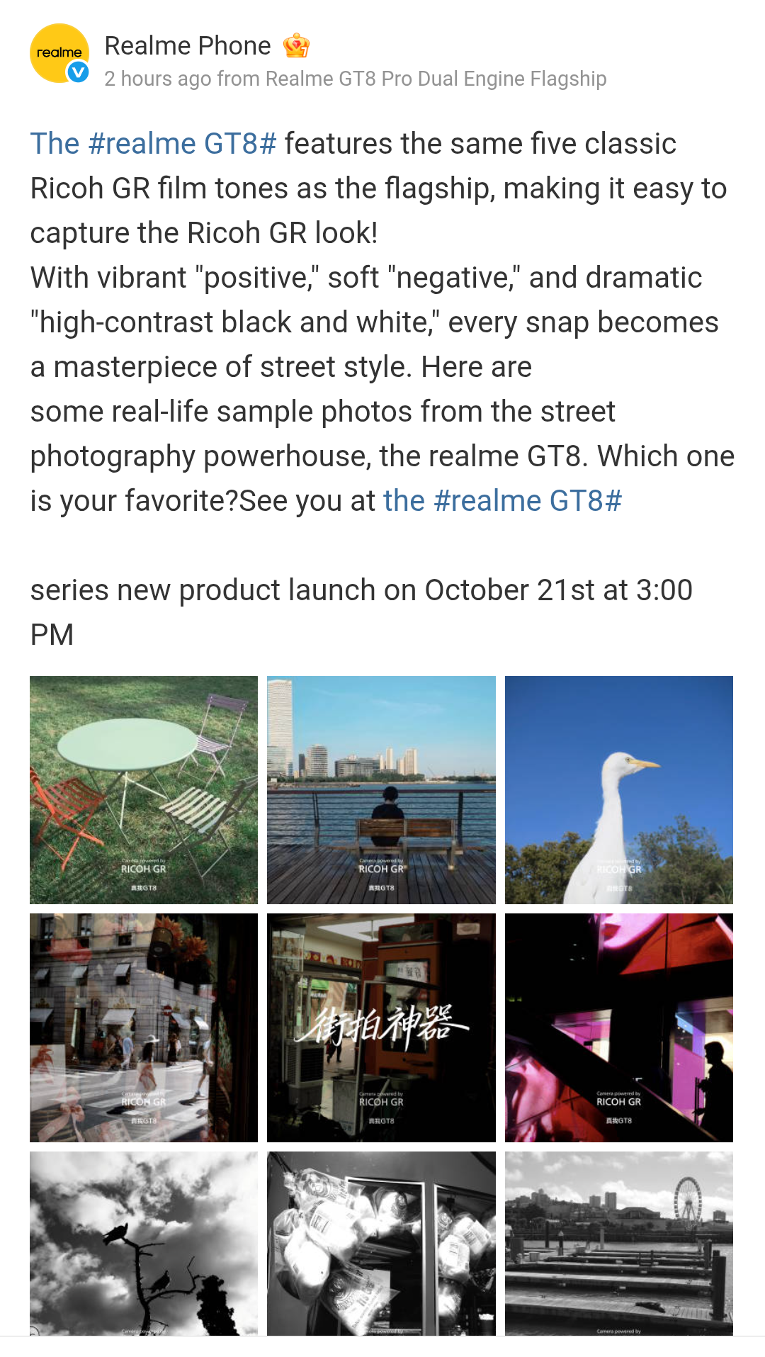 Speaking more, the same RICOH GR-branded camera features can be expected on the standard model too, and it will be offering RICOH GR’s five film tones (High Contrast Black and White, Positive, Negative, Standard, Monochrome), customizable RICOH GR camera modes (built-in 28mm and 40mm focal lengths, quick-swipe RICOH GR shutter style, immersive ViewFinder mode), and RICOH GR anti-glare main camera (developed with and certified by RICOH GR optical standards). Camera samples depicting these qualities have also been shared by the brand.