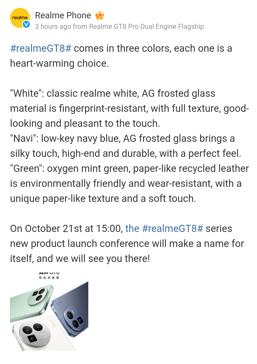 The newly-shared teaser updates reveal that the standard Realme GT 8 smartphone will also be introduced in three colors of White (AG frosted glass material), Navi (AG frosted glass material), and Green (paper-like recycled leather material), and the device will be equipped with a dual-core performance combination featuring the Qualcomm Snapdragon 8 Elite chip and the R1 gaming dedicated graphics chip. Notably, the Sky-High display will also be featured on the device supporting 2K resolution and 144Hz refresh rate, and at the rear a 50MP ultra-bright periscope telephoto camera lens will be there. Furthermore, this periscope telephoto camera lens is revealed to support 3.5x optical zoom with ‘exceptional image quality’.