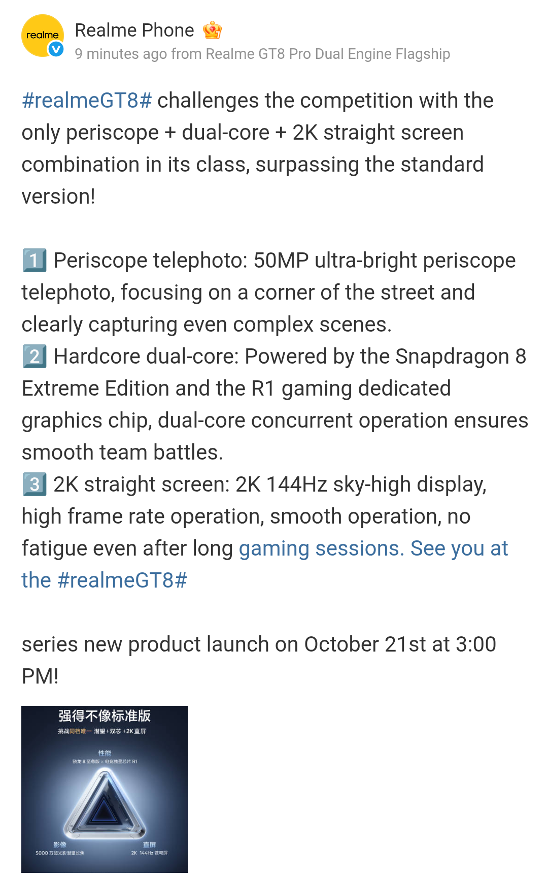 Realme GT 8 Smartphone Snapdragon 8 Elite x R1 Combination, 2K 144Hz Sky-High Display, 50MP Ultra-Bright Periscope Telephoto Camera, Three Color Choices, and More Teased Along With Realme GT 8 Pro Key Specs
